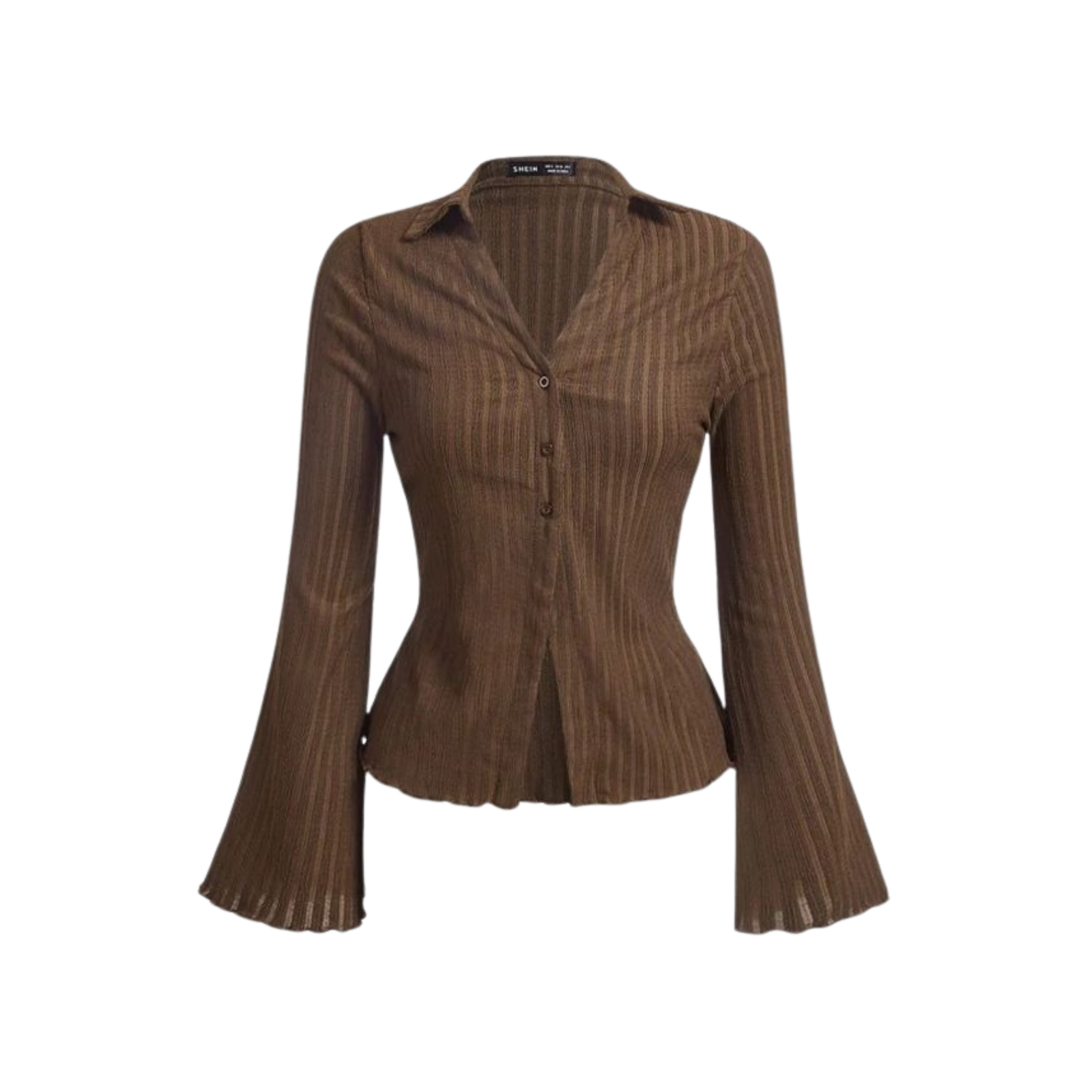 Channel early 2000s vibes with this mocha brown ribbed shirt. Featuring a fitted silhouette, textured fabric, and dramatic flared sleeves, this button-down top is the perfect mix of casual comfort and retro style.