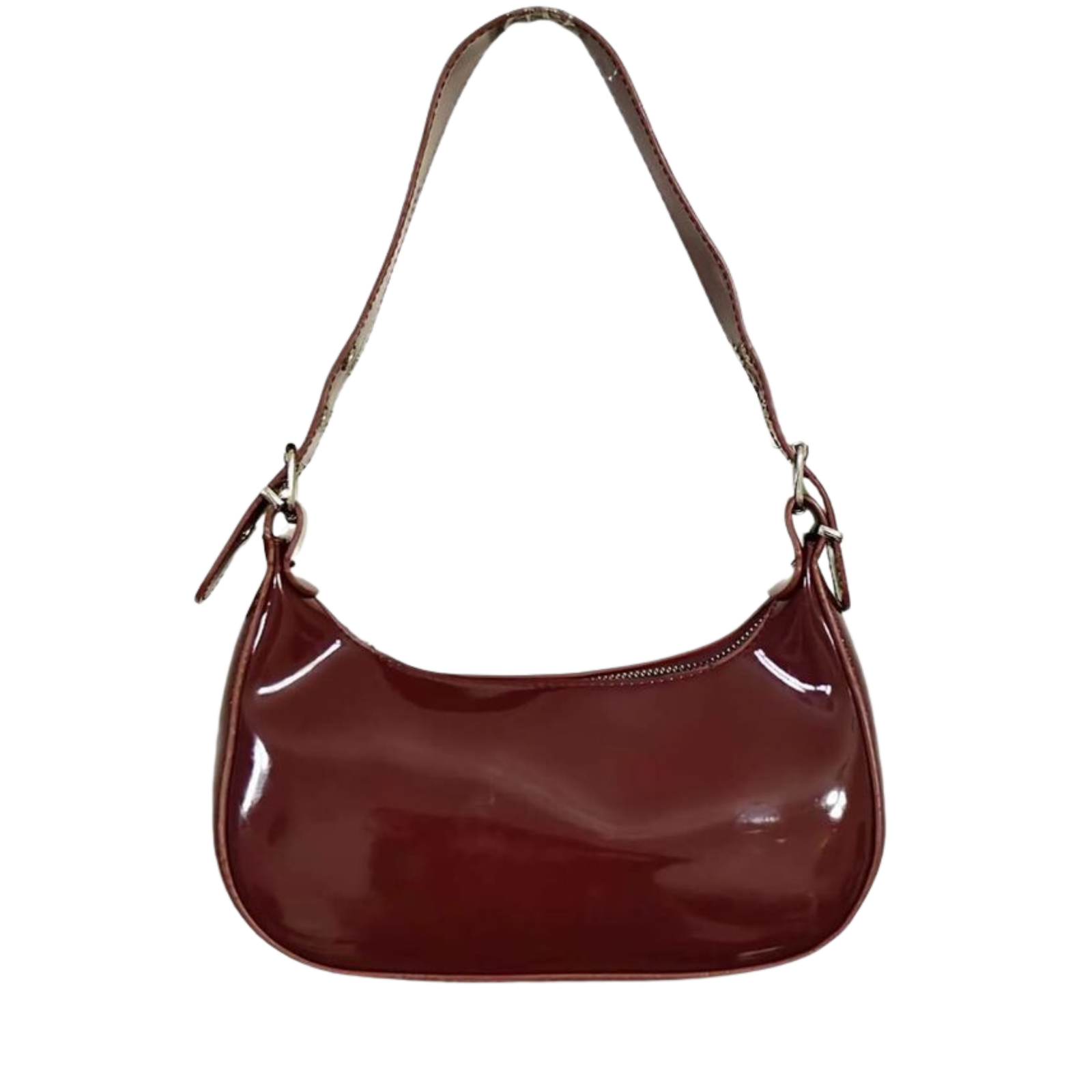Sleek, shiny, and sophisticated. This wine-red shoulder bag is crafted from high-gloss patent leather in a trendy 90s crescent shape. A minimalist staple that elevates any outfit from day to night.