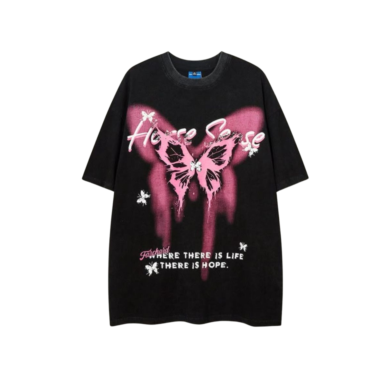Edgy meets inspirational. This washed black t-shirt features a striking spray-paint style pink butterfly and the quote “Where There Is Life There Is Hope.” The acid-wash finish gives it a perfectly worn-in, vintage streetwear look.