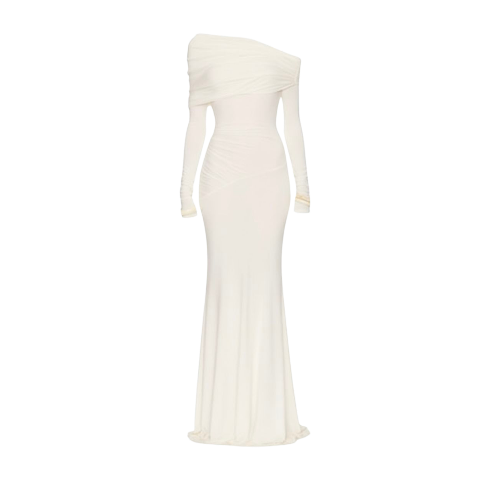 A masterpiece of modern tailoring. This ivory floor-length gown features a unique folded off-shoulder neckline and elegant long sleeves. Finished with diagonal ruching at the waist, it creates a statuesque silhouette perfect for formal galas or winter weddings.
