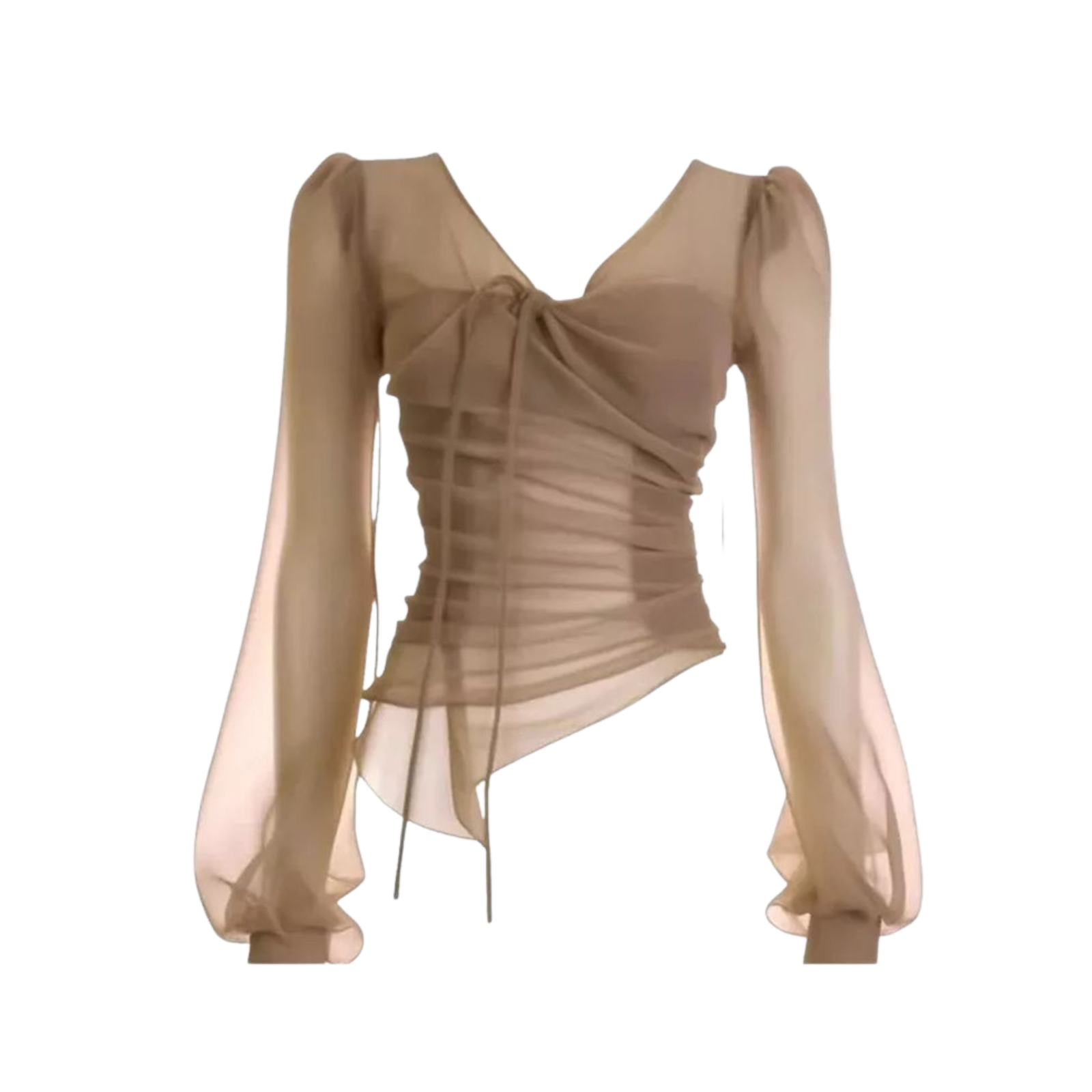 Nude Beige Sheer Mesh Long Sleeve Ruched Top