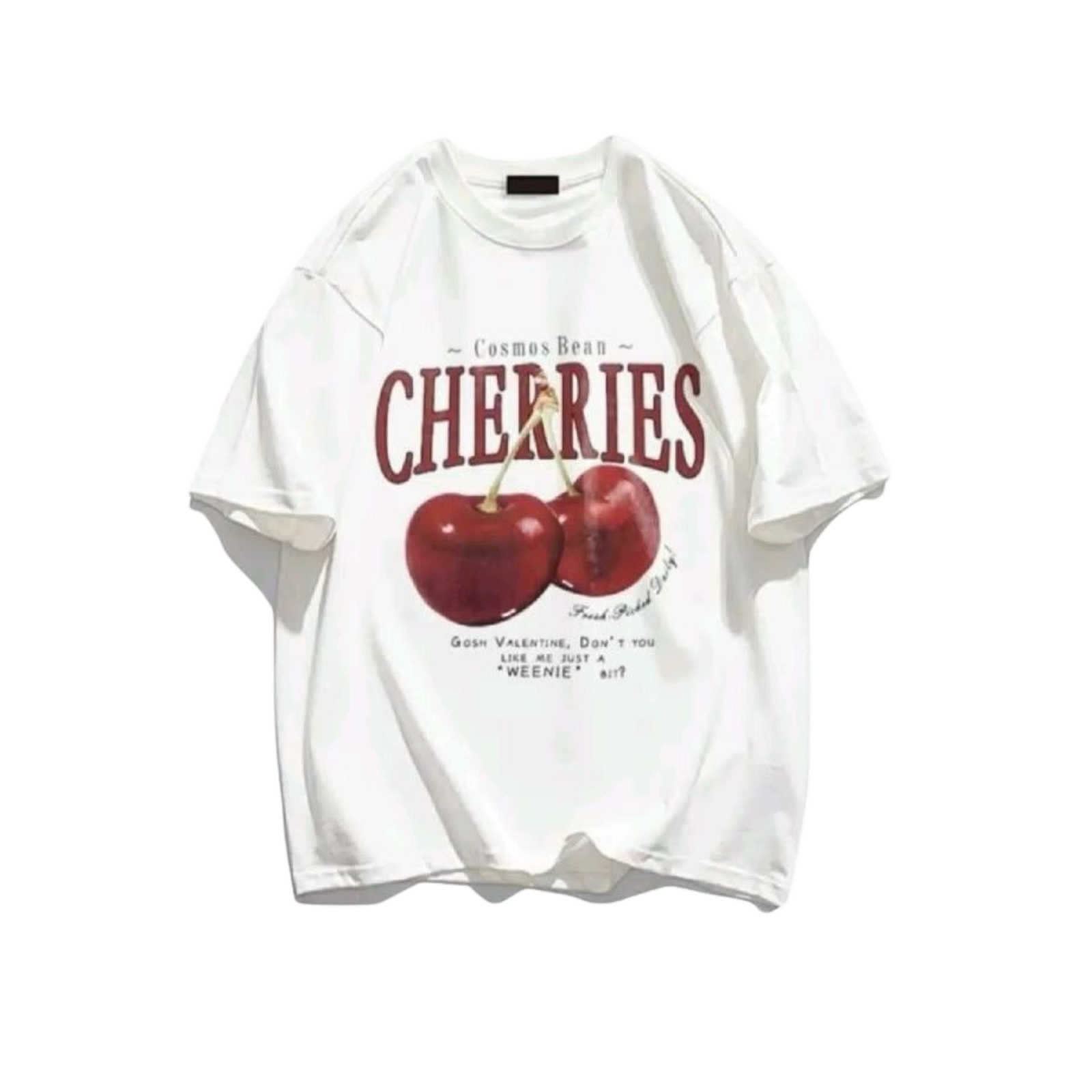 A little bit sweet, a little bit retro. Our Vintage Cherry Graphic Tee features a bold, poster-style print that looks like it came straight from a vintage farmer’s market. The oversized red “CHERRIES” text and realistic fruit illustration make it a statement piece that looks amazing tucked into high-waisted denim or a mini skirt.