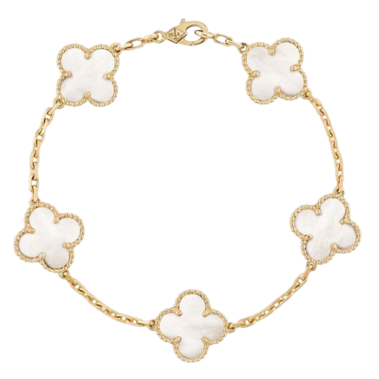 Add a touch of timeless luxury to your wrist with our White Clover 5-Motif Bracelet. This design is an absolute classic, favored by fashion icons and celebrities worldwide. The four-leaf clover is traditionally known to symbolize luck, health, fortune, and love.